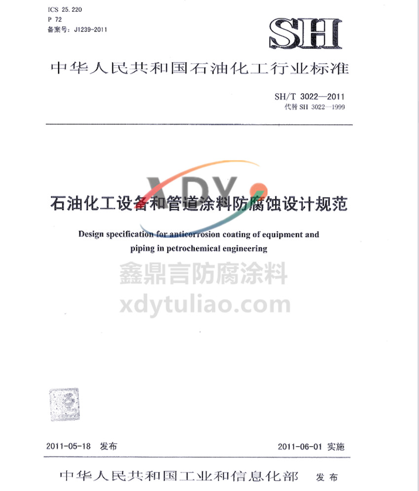 石化設備管道涂料防腐配套標準SH/T 3022-2011 石油化工設備和管道涂料防腐蝕設計規范 中華人民共和國石油化工行業標準 本規范規定了石油化工設備和管道涂料防腐配套設計要求。本規范適用于鋼質石油化工設備、管道及其附屬鋼結構的外表面涂料防腐蝕設計。