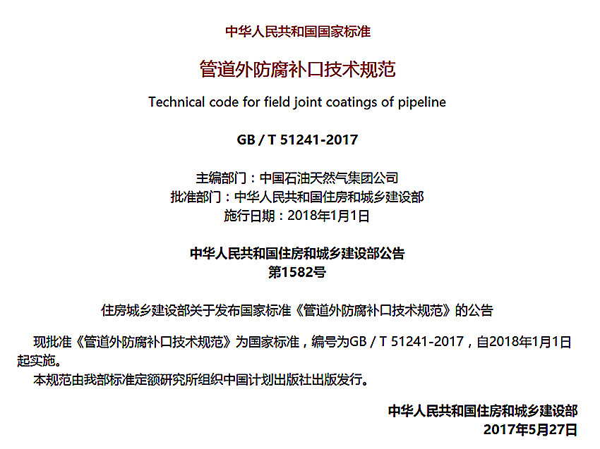 管道外防腐涂料補口標準GB/T 51241-2017