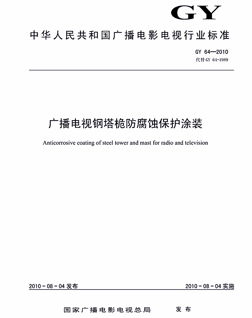 GY 中華人民共和國廣播電影電視行業(yè)標(biāo)準(zhǔn) GY 64-2010 代替 GY 64-1989 廣播電視鋼塔桅防腐蝕保護(hù)涂裝Anticorrosive coating of steel tower and mast for radio and television 2010-08-04發(fā)布 2010-08-04實(shí)施 國家廣播電影電視總局發(fā)布 本標(biāo)準(zhǔn)規(guī)定了廣播電視鋼塔桅防腐蝕保護(hù)涂裝的技術(shù)要求、檢驗(yàn)要